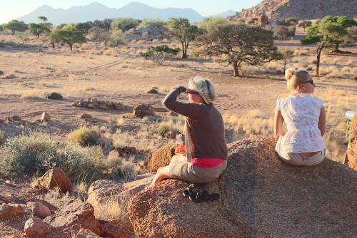 Nach fast 8 Stunden abwechslungsreicher Fahrt und 540 Kilometern über Schotterpiste kamen wir heil aber ziemlich geschafft in Onduruquea, was zwischen Karibib und Omaruru liegt, an. Wir blieben zwei Nächte und konnten uns gut von den Strapazen der Fahrt erholen. Am Abend gab es immer leckeres Wildfleisch vom Grill. Tagsüber entspannten wir herrlich am Pool. Am späten Nachmittag wurden wir zu einem tollen Game Drive durch das Farmgelände eingeladen. Neben den üblichen Wildtieren sahen wir eine große Herde Zebras und zwei verschiedene Arten Gnus.