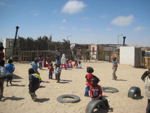 Das zweite Bild zeigt einen Kindergarten in DRC, dem illegalen Viertel von Swakopmund, wo fast ausschließlich Bretterhütten stehen. Die Erzieher hier brauchen viel Hilfe und Unterstützung, weil die meisten Eltern kein Geld haben, die Gebühren zu zahlen. Hier fehlt es an allen Ecken und Enden. Es gibt kein fließendes Wasser, keine richtige Toilette und die Kinder haben teilweise nicht mal Bleistifte, wenn sie im Januar in die Schule kommen.