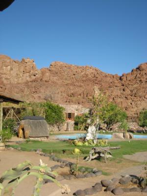 In der letzten Nacht im Etosha regnete und gewitterte es heftig, was uns schlecht schlafen ließ. Am nächsten Morgen machten wir uns auf in Richtung Huab Lodge, die in der Nähe des Brandbergmassivs liegt. Aufgrund des Regens waren die Schotterstraßen teilweise unterspült und es hatten sich riesige Wasserlöcher auf ihnen gebildet, was die Fahrt sehr interessant gestaltete. Aber Auto und Fahrer(in) meisterten die Strecke gut und so kamen wir nach vier Stunden Fahrt heil in der schönen Lodge an. Auch hier waren wir wieder fast alleine, wie schon in den anderen Lodges. Wir fühlten uns hier sehr wohl in der familiären und herzlichen Umgebung. Jan, der Besitzer der Lodge, nahm uns am Nachmittag mit auf eine Tour durch das Farmgelände. Dort ist vor zwei Tagen eine Elefantenherde durchgerannt. Aber wir sahen leider nur noch deren Spuren. Dafür zeigten sich wieder viele Oryxe und das erste Mal sahen wir sogar kleine Oryxkinder