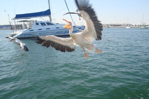 Als der Katamaran auf das Meer startete, wurden wir von hungrigen Pelikanen verfolgt, die dann auch mit Fischen gefüttert wurden.
