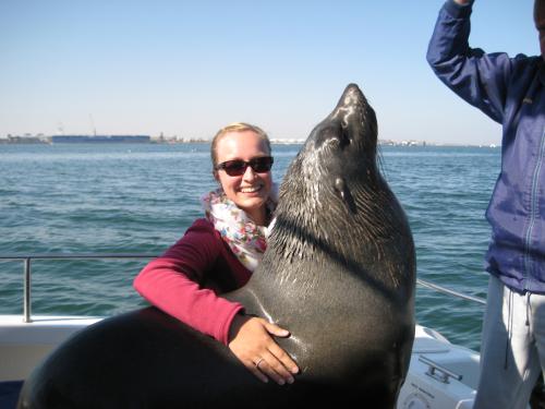 Danach wollte auch noch eine kleinere Robbendame zu uns aufs Boot. Die war auch sehr sehr lieb und zahm. Man beachte ihre Flossen, die sie um mich geschlossen hält :)