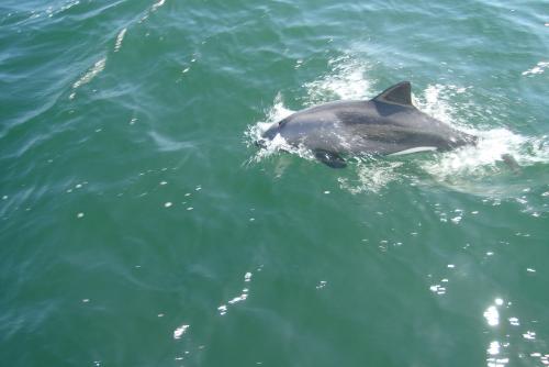 Danach fuhr der Kapitän etwas weiter raus und wir konnten endlich die versprochenen Delfine sehen. Das hier sind die kleinen Delfine. Sie begleiteten sehr lang unseren Katamaran und wir konnten tolle Fotos schießen.