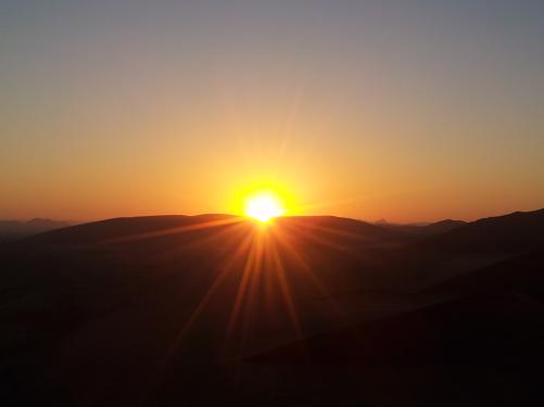 An diesem Abend gingen wir alle sehr früh schlafen, denn am nächsten Morgen wollten wir noch vor Sonnenaufgang losfahren. So riss uns um 4:30 Uhr der Wecker aus dem Schlaf. Noch schlaftrunken ging es zur Düne 45, um von dort aus den Sonnenaufgang beobachten zu können. Jetzt hieß es Frühsport zu machen, denn den Sonnenaufgang sieht man natürlich von oben am besten. Das war ganz schön hart, aber nach unseren beiden Sportstudenten war ich die dritte im Ziel :)
