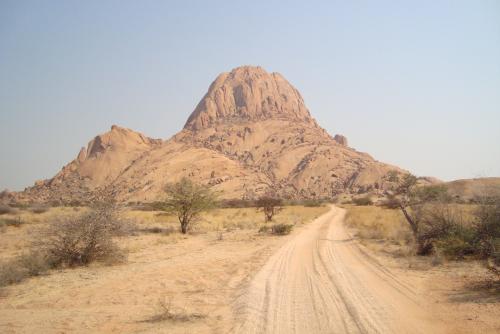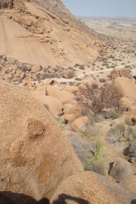 Heute Morgen wurden wir sanft von der aufgehenden Sonne geweckt und dann gab es ein entspanntes Frühstück mitten im Nirgendwo. Keine Menschenseele, nur Natur und ein paar Klippschliefer. Gut gestärkt konnten wir dann die Spitzkoppe bis zur Hälfte erklimmen. Das war ein ganz schöner Marsch und ein Gekraxel über kleine und große Felsen, aber wir haben es soweit geschafft, wie wir konnten und der nicht vorhandene Weg zu Ende war. Unser Auto war nur noch so groß wie eine Ameise (der kleine weiße Polo) und wir hatten einen atemberaubenden Ausblick.